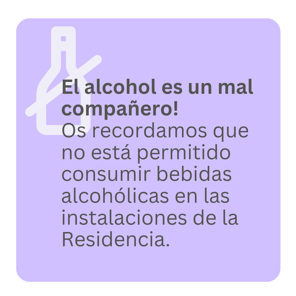 Esta semana os recordamos: en la Residencia no está permitido consumir bebidas alcohólicas. Debéis ser muy responsables en este tema, por las consecuencias que crean los efectos del alcohol en vosotros mismos, en el entorno que compartís, en la alteración del comportamiento, ruidos, molestias, incluso desperfectos. Os pedimos rigurosidad con el cumplimiento de esta norma, ya que es vuestra responsabilidad pero también implicáis la seguridad y responsabilidad de vuestros compañeros, del personal y de la dirección de la Residencia.